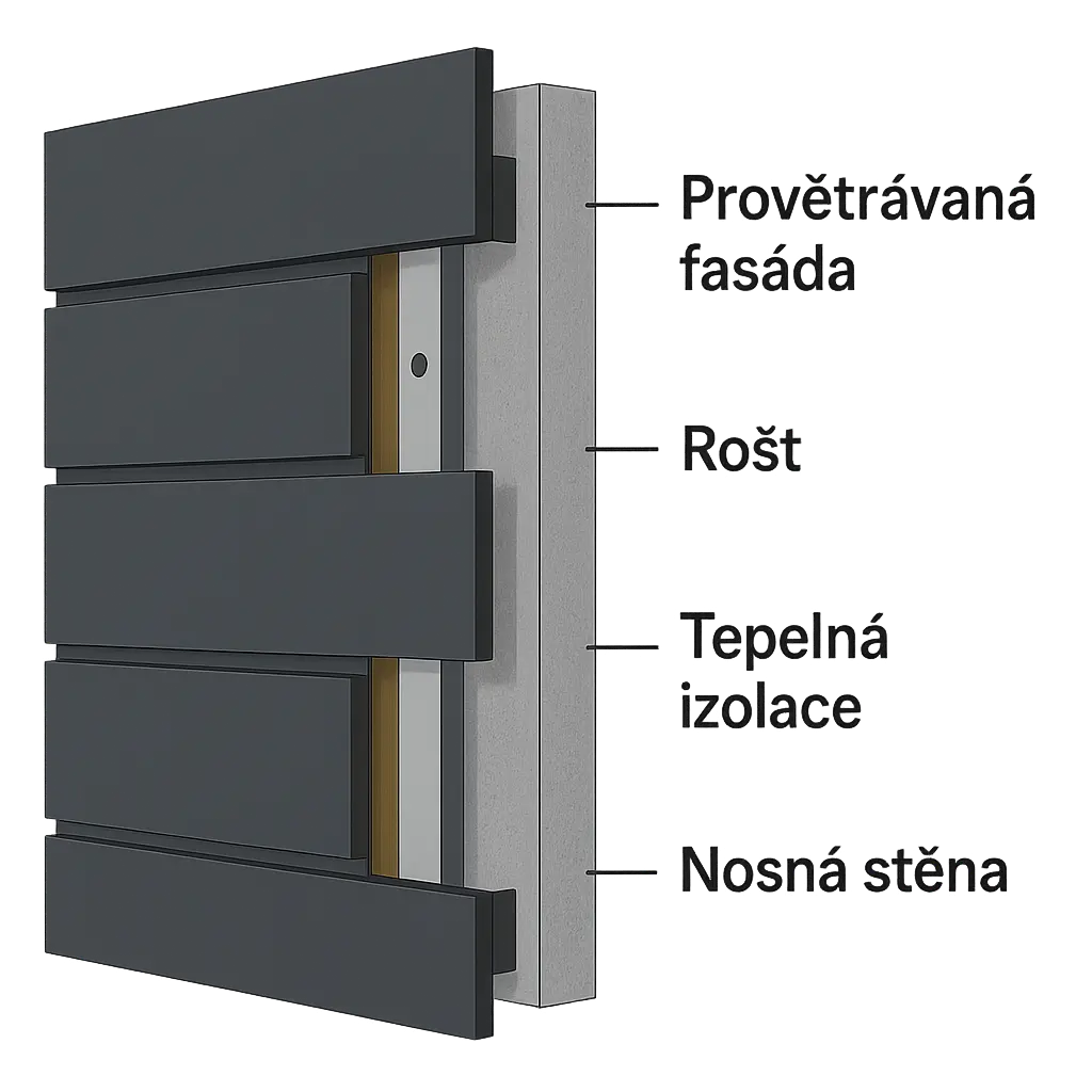 Princip provětrávané fasády spočívá ve vytvoření vzduchové mezery mezi nosnou konstrukcí budovy a vnějším fasádním obkladem. Tento systém zajišťuje efektivní odvětrávání vlhkosti, zlepšuje tepelně-izolační vlastnosti budovy a prodlužuje životnost celé fasády.